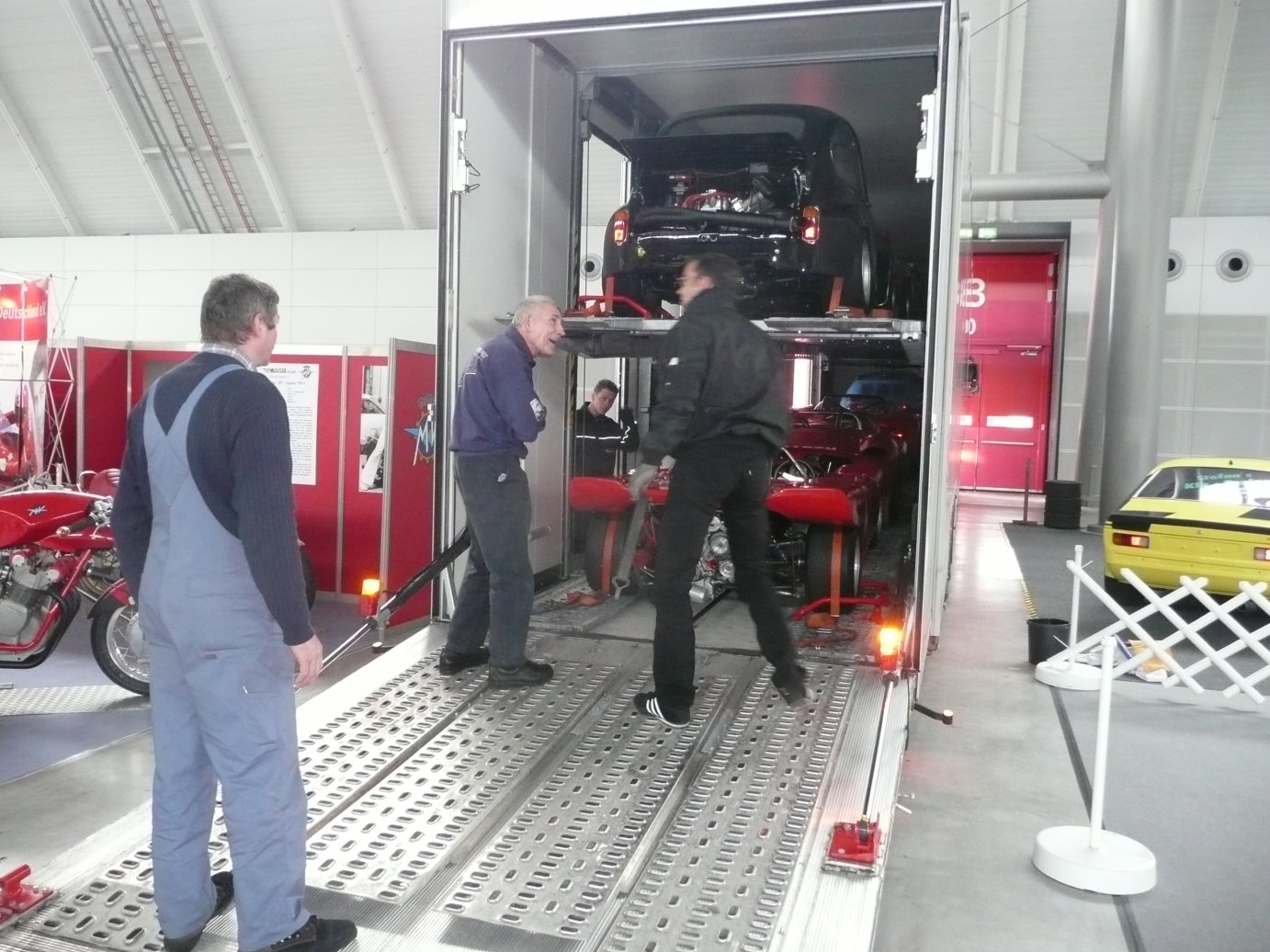 Die Abarths werden am früehen Morgen mit einem Spezialtransporter bbgeholt